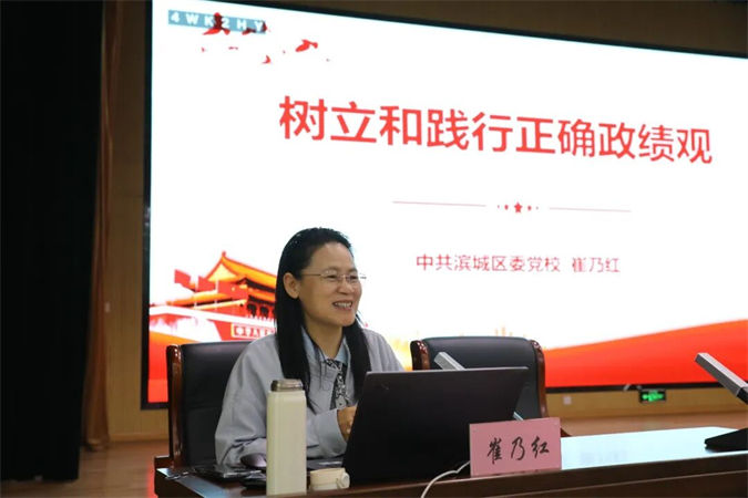 读书班分为专题辅导、个人自学、交流研讨三个环节。专题辅导在北平楼报告厅举行,学校特邀中共滨城区委党校副校长、正高级讲师崔乃红作《树立和践行正确的政绩观》专题授课,学校党委副书记、校长张洪青主持并讲话。