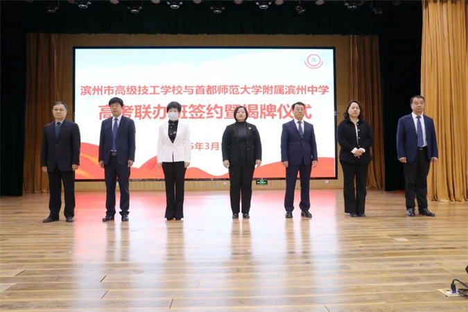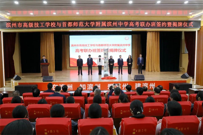 为深化产教融合、职普融通,推进全区职业教育高质量发展,3月14日,滨州市高级技工学校与首都师范大学附属滨州中学联合办学签约暨揭牌仪式在滨州市高级技工学校报告厅隆重举行。