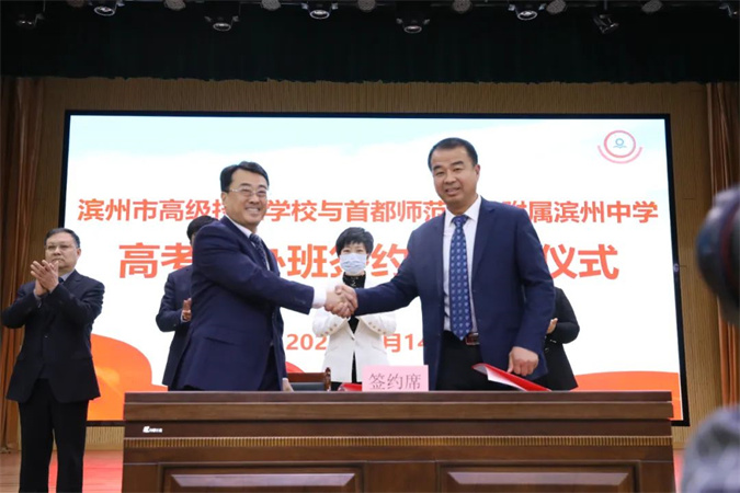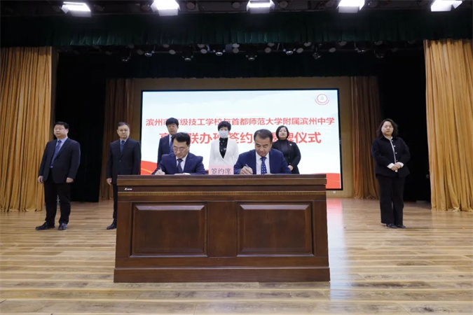 滨州市高级技工学校(滨州市中等职业学校)党委副书记、校长张洪青与首都师范大学附属滨州中学党总支书记、校长侯建军共同签署合作办学协议。