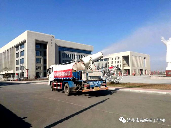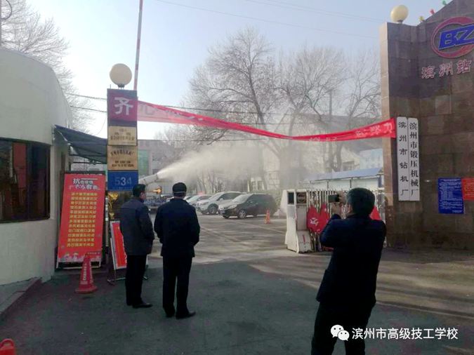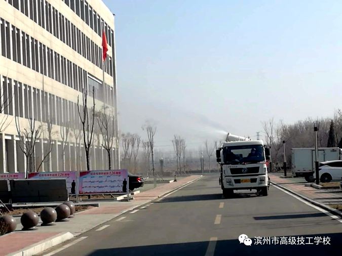 2月10日,滨城区里则街道办事处岔吴四村党支部书记吴红刚,用自己的消毒车义务为滨州市高级技工学校消毒。