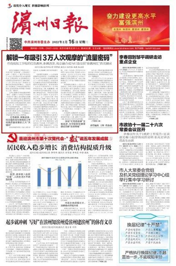 2022年2月16日出版的《滨州日报》在头版头条,以《解锁一年吸引3万人次观摩的“流量密码”》为题,专题报道滨州市高级技工学校(滨州市中等职业学校)红色办学经验以及在职教改革、产教融合等方面取得的成就。