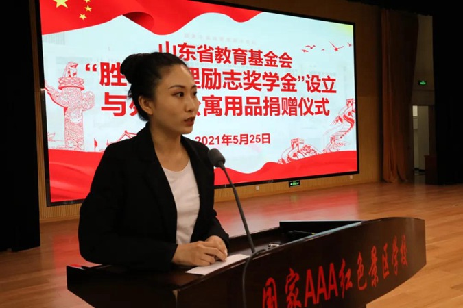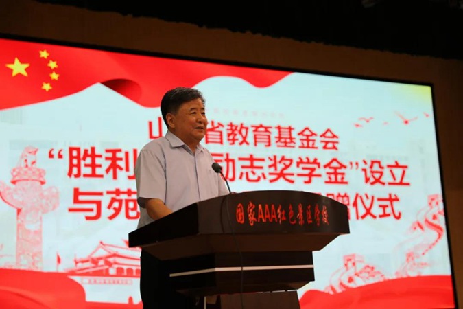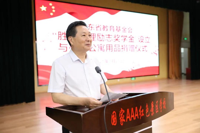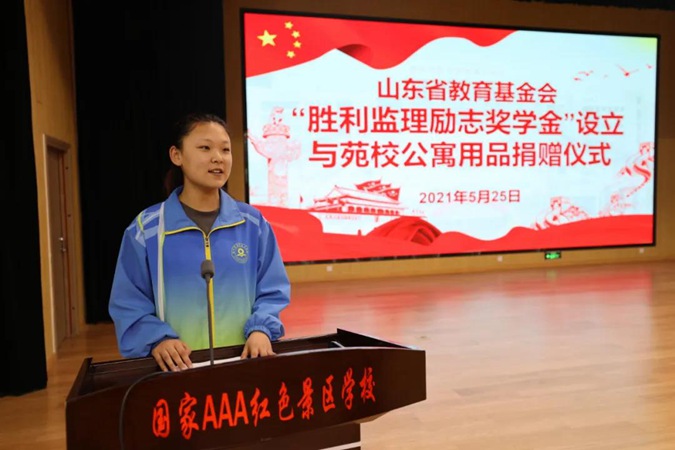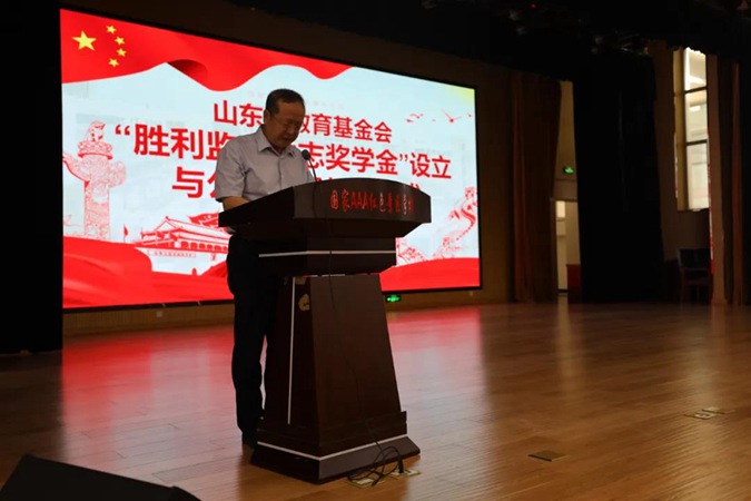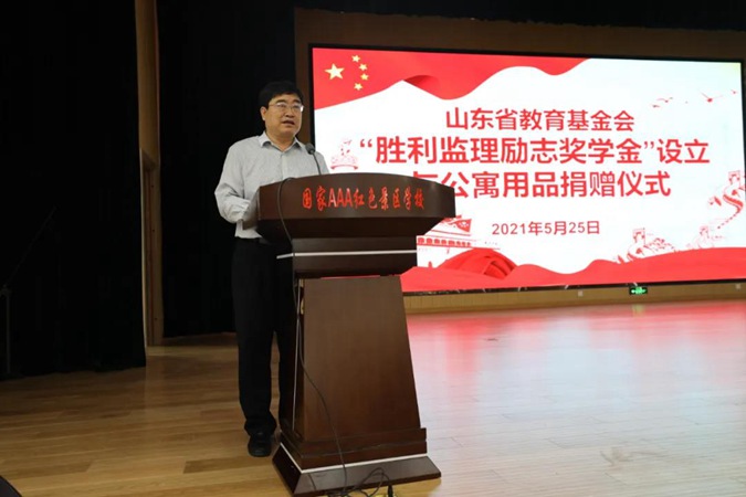 王树林致辞,代表全校4500师生及其背后成千上万人的亲人团,对各位领导的光临和企业家的善举表示热烈欢迎和衷心的感谢。他表示,通过山东省教育基金会进校园,通过“胜利监理励志奖学金”进校园,通过苑校工贸公司红色温馨进校园,红色的力量,必将在红色校园扎根、发芽、开花、结果。