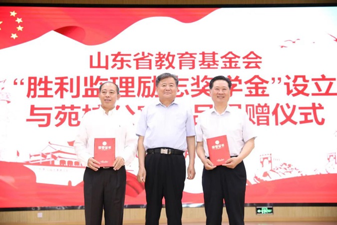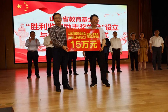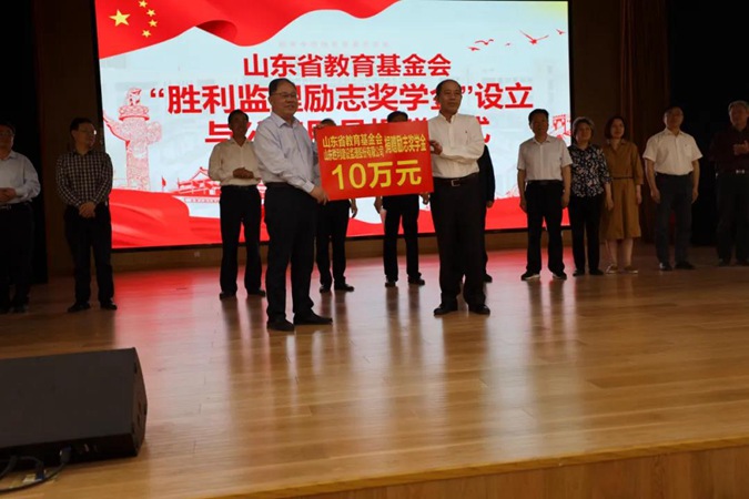 艾万发向滨州市高级技工学校捐赠10万元,用于设立“胜利监理励志奖学金”。孟维赞代表学校接受捐赠,并举行揭牌仪式。