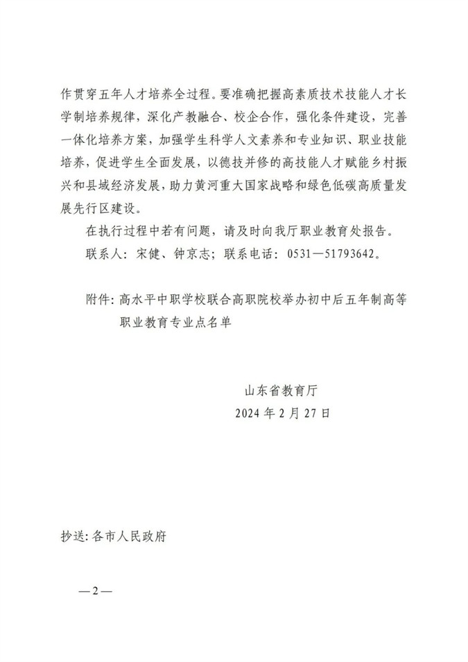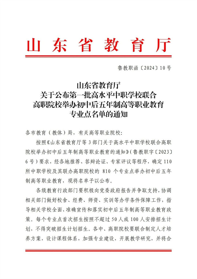 2024年2月,山东省教育厅下发《山东省教育厅关于公布第一批高水平中职学校联合高职院校举办初中后五年制高等职业教育专业点名单的通知》(鲁教职函〔2024〕10号),滨州市中等职业学校(滨州市高级技工学校)申报的机电技术应用、电子商务、数控技术应用、汽车运用与维修、计算机网络技术、会计事务、新能源汽车运用与维修七个专业获山东省教育厅批准。滨州市内本地初中毕业生能够在我校就读高职了!
