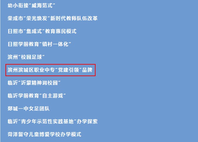 4月15日,山东省教育厅公布“致敬品牌·献礼二十大”大型展示传播活动入选项目,滨州市高级技工学校(滨州市中等职业学校)报送的“职业中专‘党建引领’品牌”榜上有名,是全市两个入选项目之一。