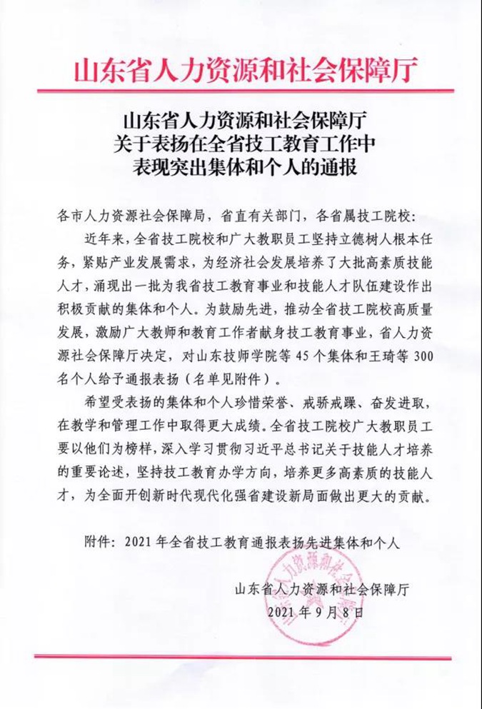 9月8日,山东省人力资源和社会保障厅印发《关于表扬在全省技工教育工作中表现突出集体和个人的通报》,滨州市高级技工学校作为先进集体获通报表扬。这是继2019年后,第二次获省人社厅通报表扬,也是近年来学校第22项省级以上表彰。