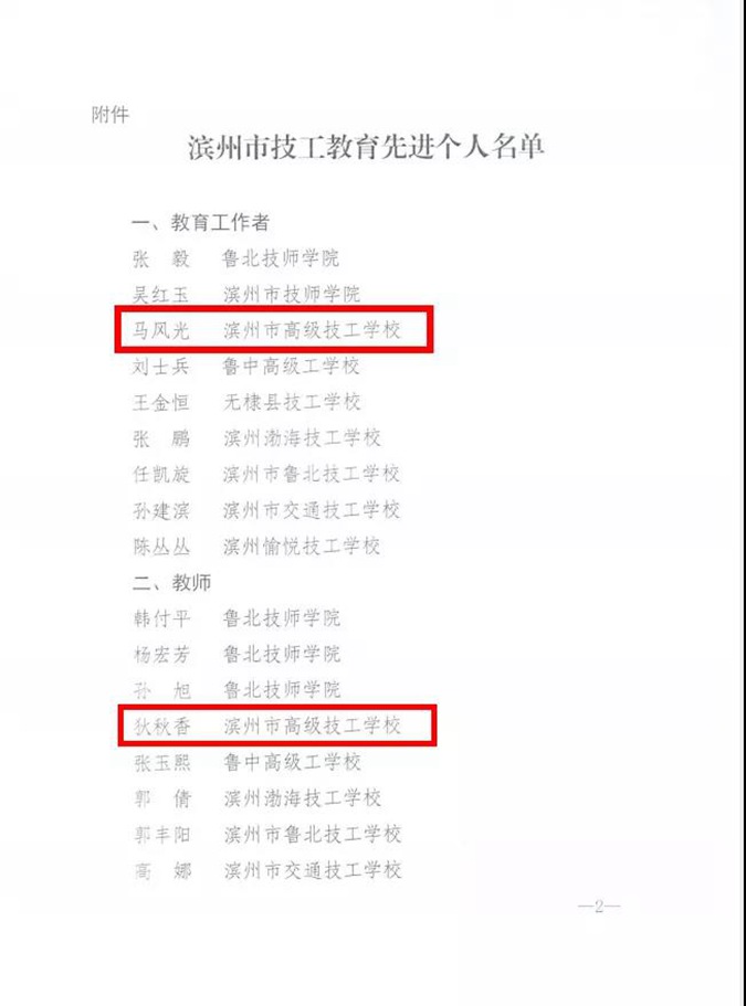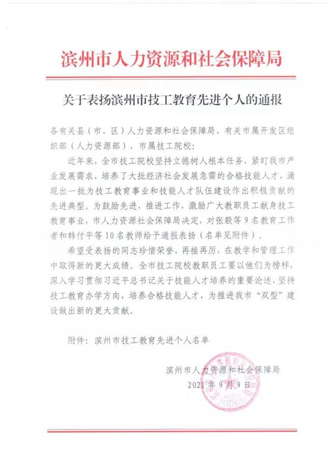 9月9日,滨州市人力资源和社会保障局印发《关于表扬滨州市技工教育先进个人的通报》,滨州市高级技工学校招生就业科副科长马风光作为先进教育工作者、升学部副主任狄秋香作为先进教师分别获市人社局通报表扬。