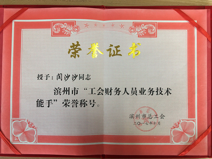 在2017年滨州市工会财务人员业务技能竞赛中,我校闫沙沙老师取得了个人二等奖的优异成绩。闫沙沙老师此次获奖代表了我校机关工会财务管理的水平。