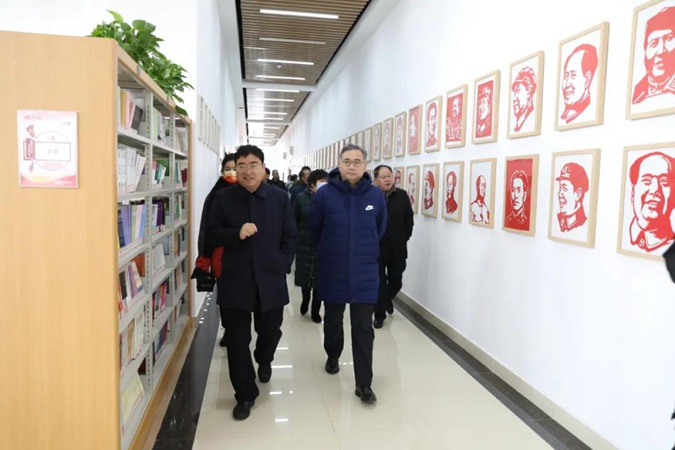 在讲解员讲解引导下,李庆义一行参观了东方红广场,到嘉兴楼参观了实训基地,到韶山楼参观了教学楼红色文化建设,经红色连廊到井冈山楼参观了产教融合项目产教工坊,最后到北平楼参观了伟人塑像厅、红色藏品展馆、将军书画展厅及党史教育展馆、校史馆等。