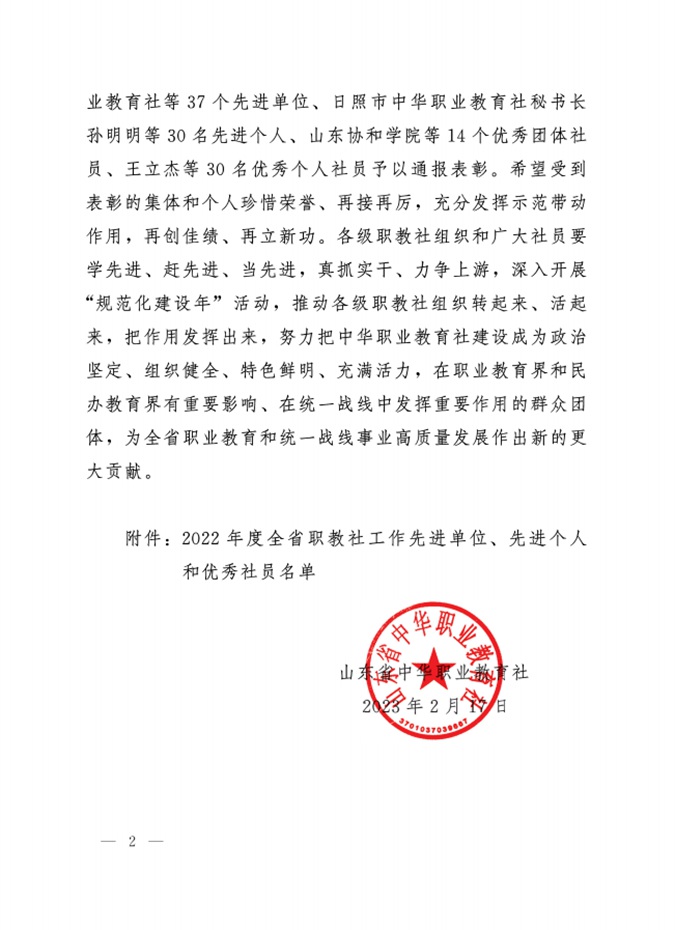 近日,山东省中华职业教育社文件印发《关于表彰2022年度全省职教社工作先进单位、先进个人和优秀社员的通报》,滨州市高级技工学校党委书记、校长王树林荣获“山东省中华职教社优秀个人社员”称号。