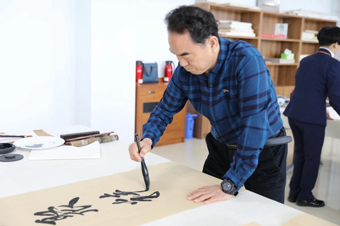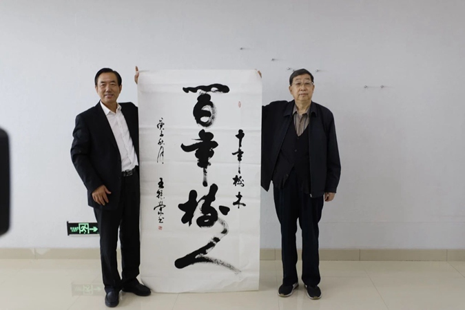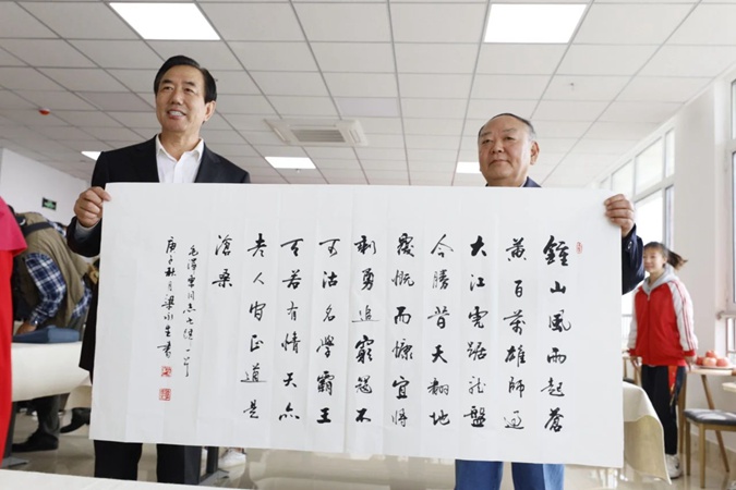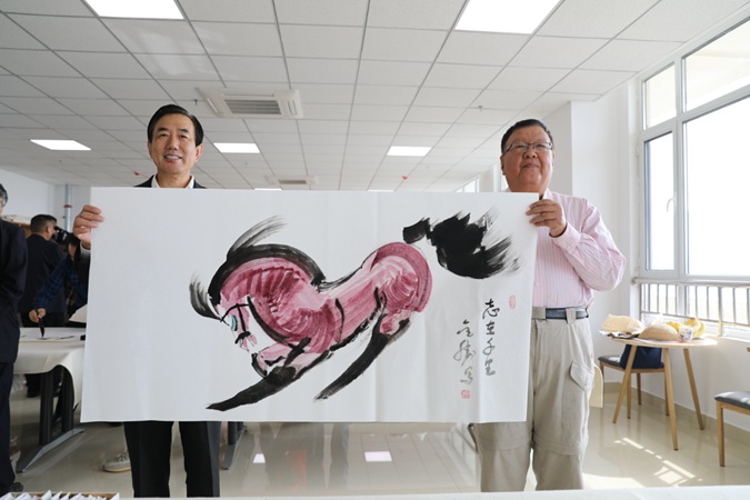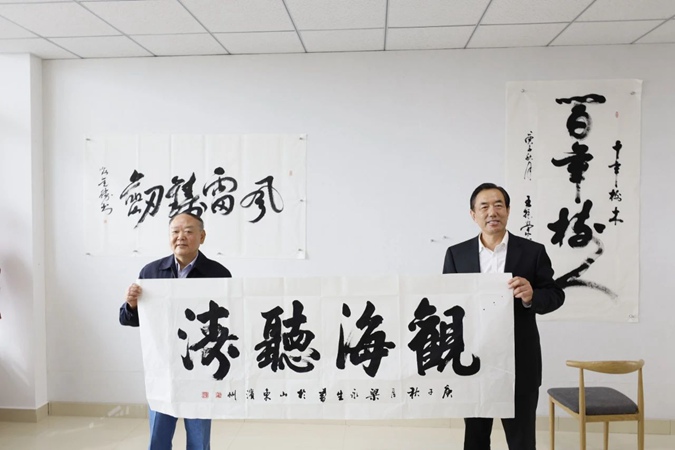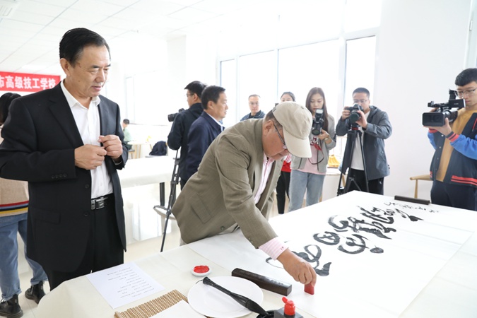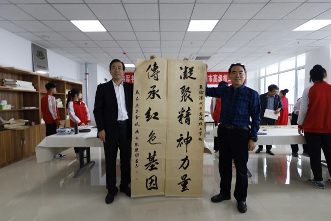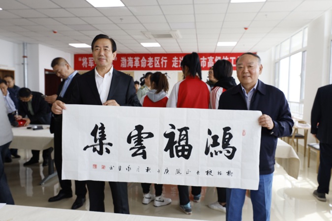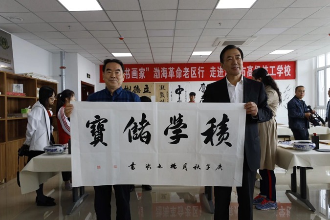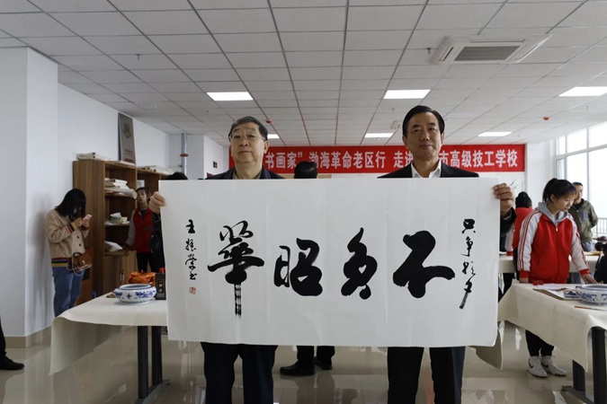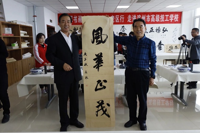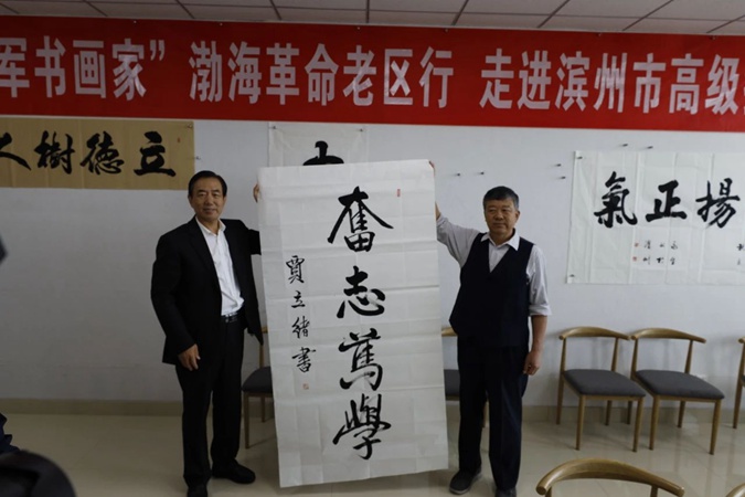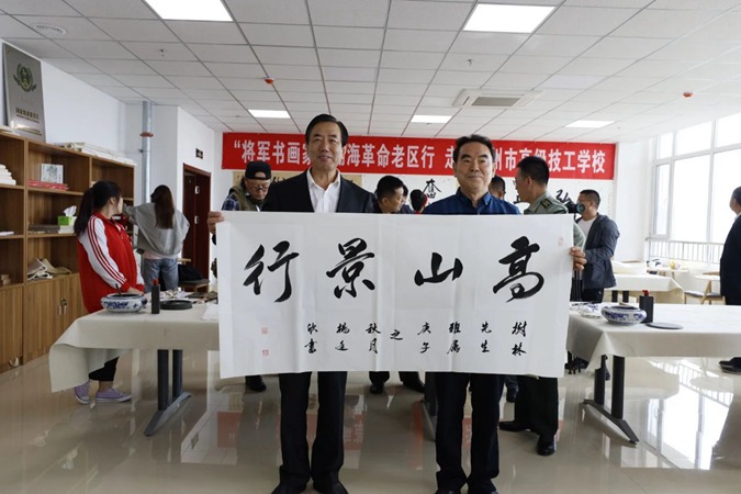 秋高气爽,翰墨飘香。10月10日上午,原中央军委装备部某基地副政委,著名军旅书画家刘全胜少将;原总装备部马兰基地副司令员贾立绪少将;原中国人民解放军装甲兵工程学院院长,现任某学院书画院院长、中国书法家交流协会副主席、中国将军书画研究院副院长梁永生少将;中国核试验基地原政委,现任中国书画家协会理事、中国将军书画院副院长王振荣少将;原酒泉卫星发射中心政委,著名军旅书法家刘克仁少将;原中国人民解放军总后勤部军备研究所所长,高级专家、中书协会员、著名军旅书法家、诗人杨廷欣少将;国家一级演员、女高音歌唱家侯丽娟;新华社国家城市评论主任记者、中国新闻摄影协会副会长李玉跃;军旅书画家、工艺美术大师韩美林学生吕军锋一行走进滨州市高级技工学校,参观红色校园,现场创作书画作品。