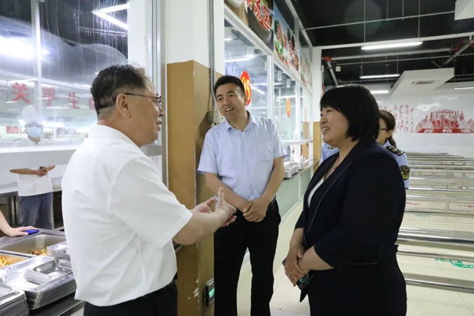 曲婕一行听取学校食品安全监管责任落实情况汇报,到西柏坡楼餐厅对食品加工、留样、餐具存放、消毒等情况进行了实地查验。