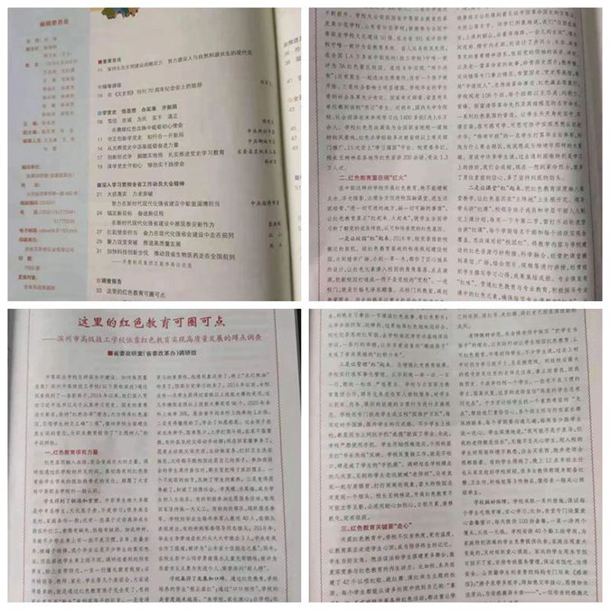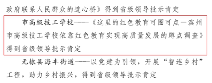 4月25日至29日,山东省委政策研究室到滨州市高级技工学校(滨州市中等职业学校)蹲点调研,向省委提交了《这里的红色教育可圈可点——滨州市高级技工学校依靠红色教育实现高质量发展的蹲点调查》,全面总结了该校红色育人、高质量发展的经验和做法,提出了进一步在全省学习、推广的建议。4月30日,省委副书记杨东奇作出重要批示,要求各级新闻媒体深入挖掘、广泛宣传,教育部门也要积极推广学校的做法。省委书记刘家义等领导进行了阅批。省教育厅总督学邢顺峰批示“请上报中央教育领导小组秘书局。”