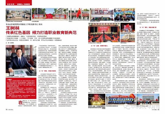 4月上旬,《中华英才》2021年第七期刊发文章《王树林:传承红色基因,倾力打造职业教育新典范》,对滨州市高级技工学校党委书记、校长王树林进行了专题报道。