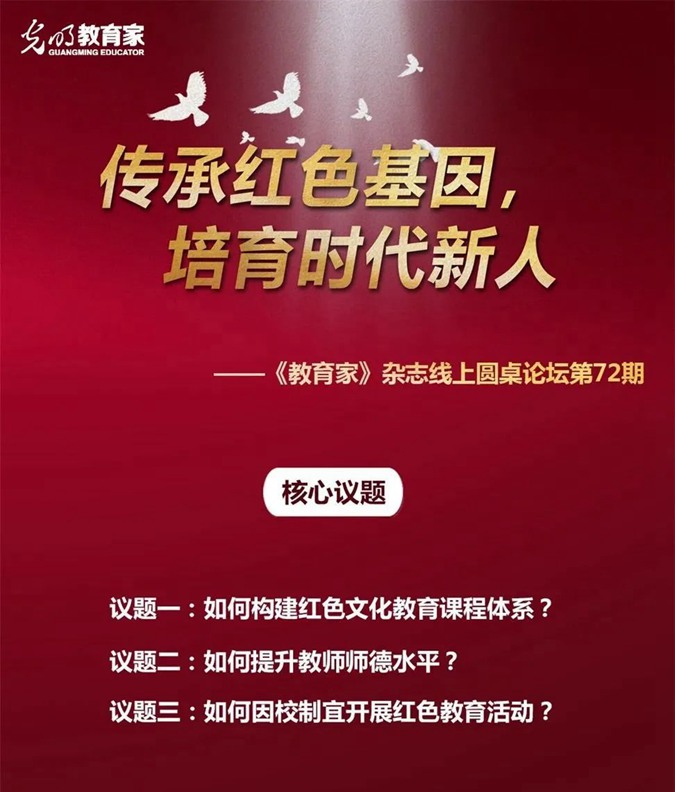 6月4日下午,王树林应邀参加第72期《教育家》杂志线上圆桌论坛,并围绕“传承红色基因,培育时代新人”议题做经验介绍。