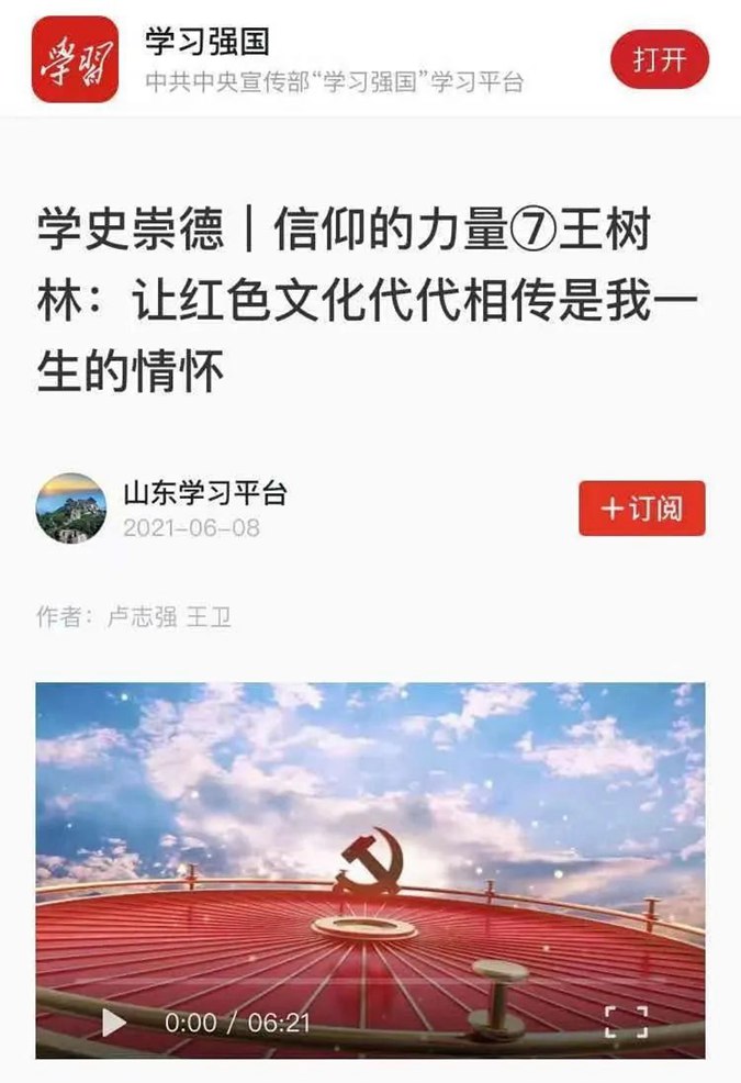 6月8日,大众网“信仰的力量”第七期发表专访王树林文章《让红色文化代代相传是我一生的情怀》,并被《学习强国》平台选登。