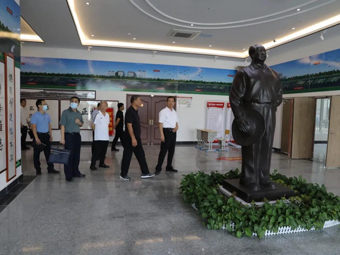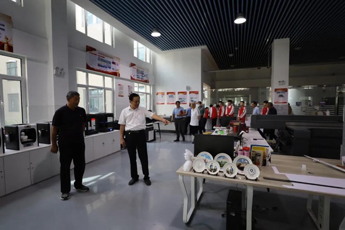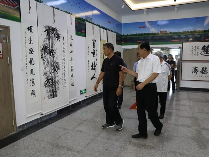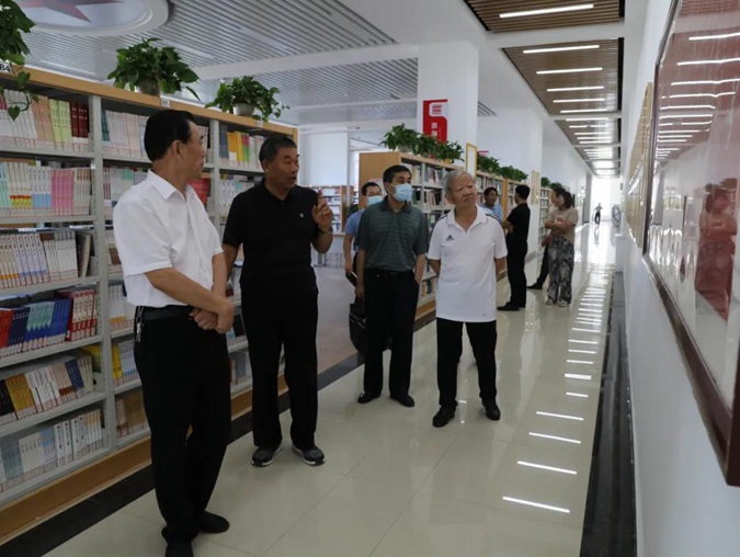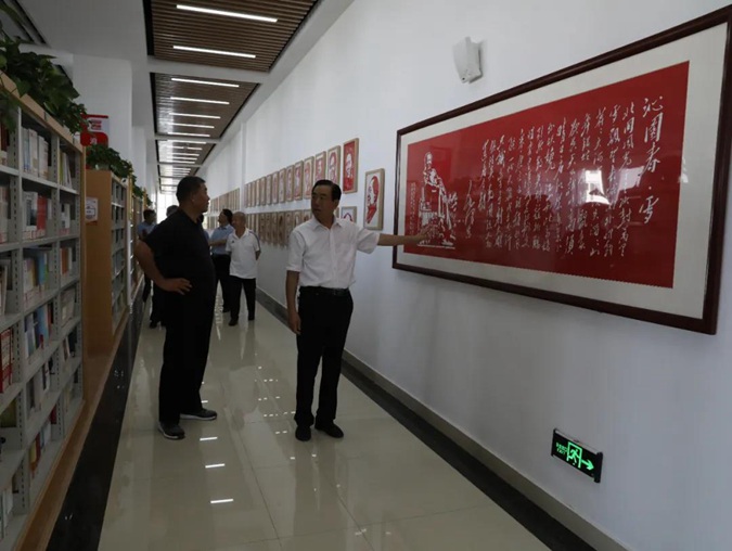 王保民一行在嘉兴楼参观了实训中心及学生作品展示,到韶山楼、遵义楼参观了红色文化建设,经红色连廊到北平楼参观了图书馆、将军书画展。