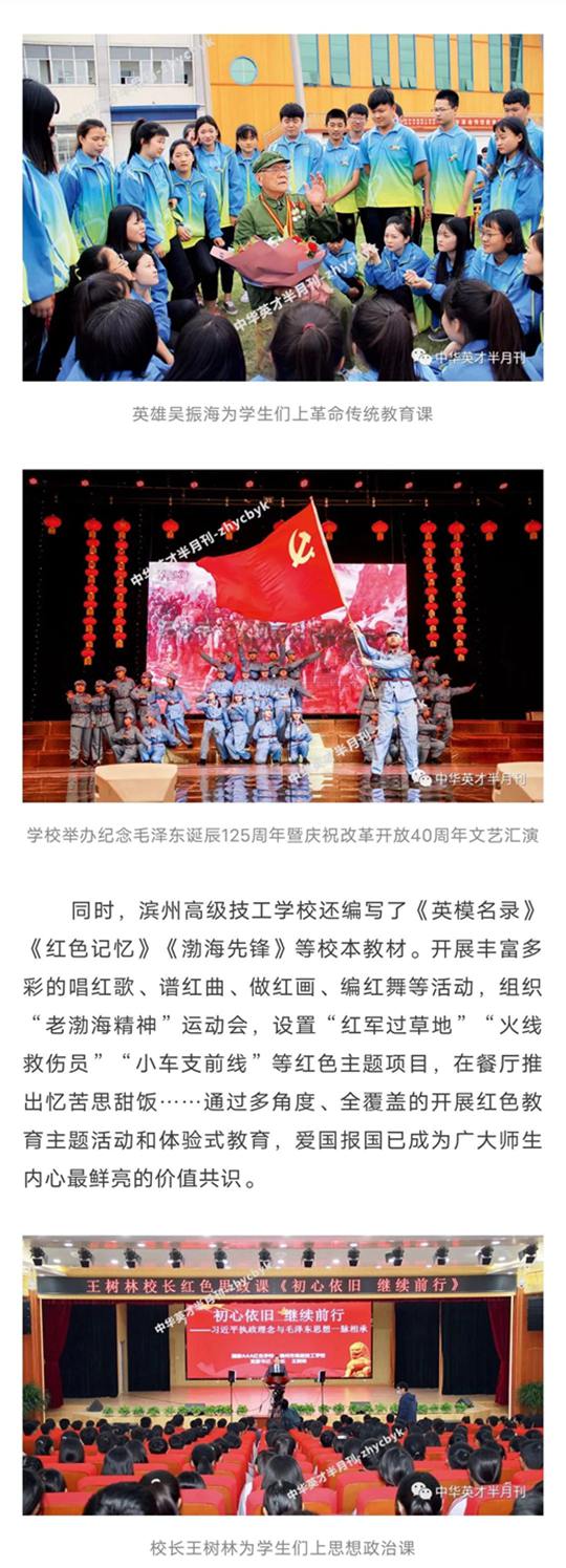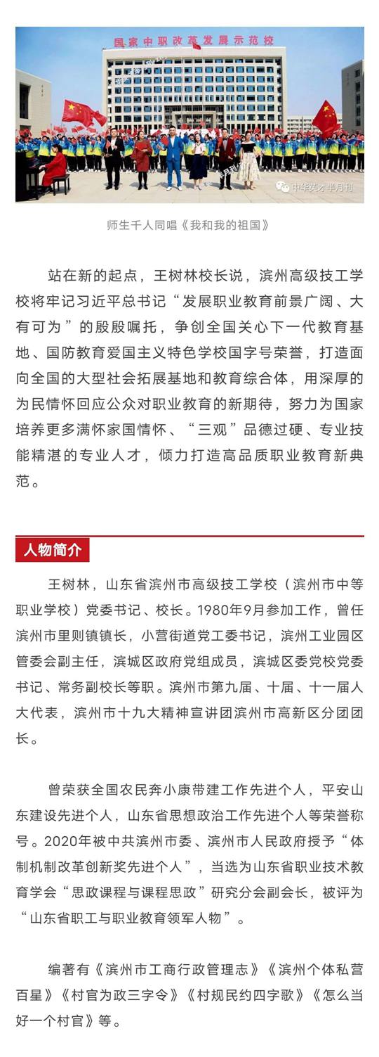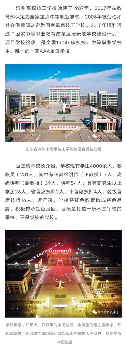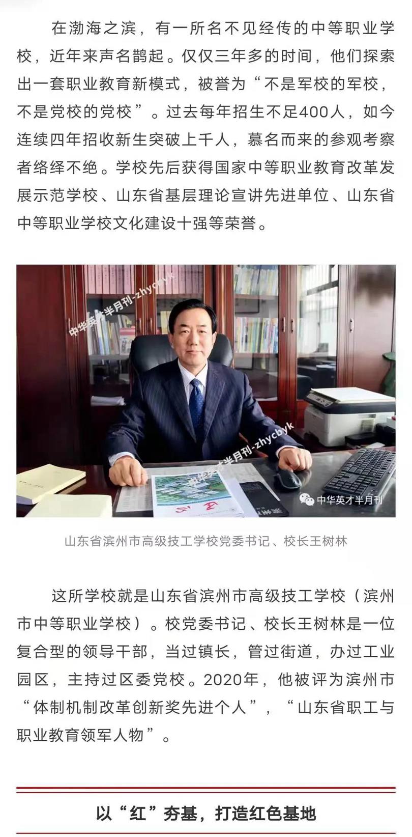 近日,《中华英才》2021年第七期刊发文章《王树林:传承红色基因,倾力打造职业教育新典范》,对滨州市高级技工学校党委书记、校长王树林进行了专题报道。
