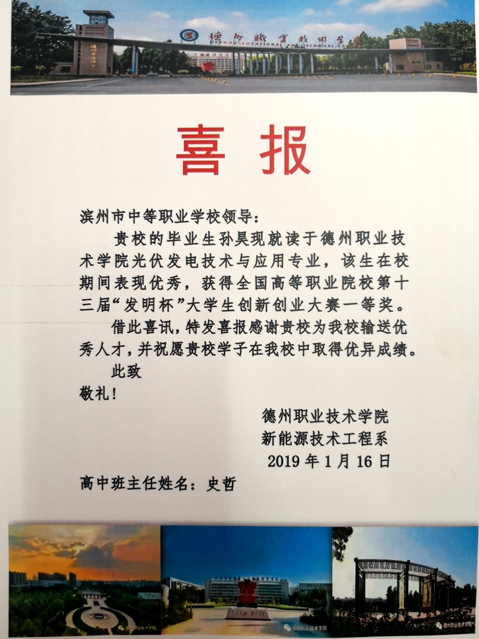 孙昊同学在我校学习期间,不仅勤学乐思、成绩优异,而且兴趣广泛,积极参与学校活动,始终保持了昂扬的精神状态,获得了综合素质的全面发展,在2017年春季高考后,被德州职业技术学院光伏发电技术与应用专业录取。大学期间,他荣获全国大学生奖学金三等奖,获“优秀大学生”荣誉称号。