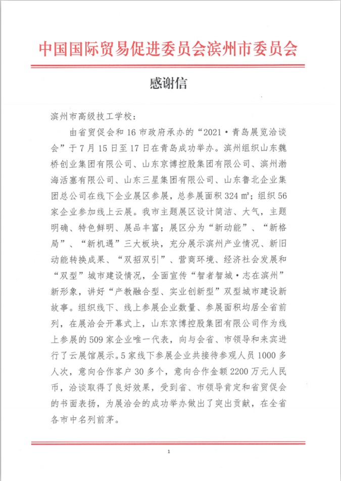 中国国际贸易促进委员会滨州市委员会致滨州市高级技工学校感谢信
