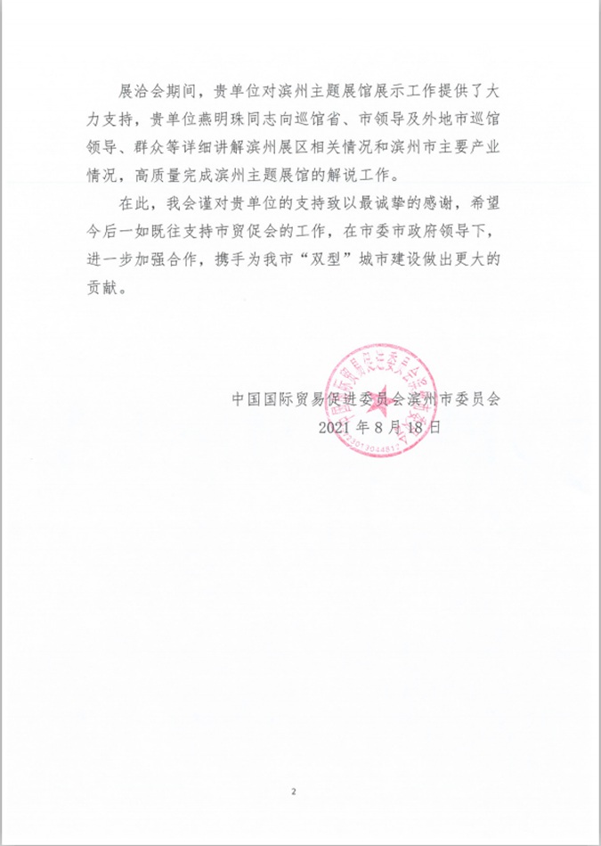 7月15日至17日,由省贸促会和全省16市政府承办的“2021新动能·青岛展览洽谈会”在青岛举办。滨州市高级技工学校燕明珠老师作为讲解员,向巡馆省、市领导及外地市巡馆领导、群众详细讲解滨州展区相关情况和滨州市主要产业情况,高质量完成主题展馆的解说任务,受到各级领导好评。8月18日,中国国际贸易促进委员会滨州市委员会特此发来感谢信,为滨州市高级技工学校对主题展馆展示工作的支持表示感谢。