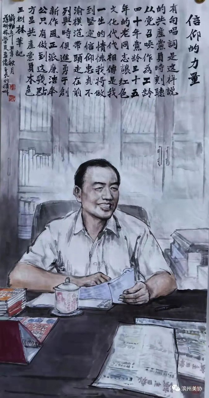 滨州市美术家协会主席李玉泉为滨州市高级技工学校党委书记、校长王树林创作的画作“全国关心下一代先进工作者王树林”