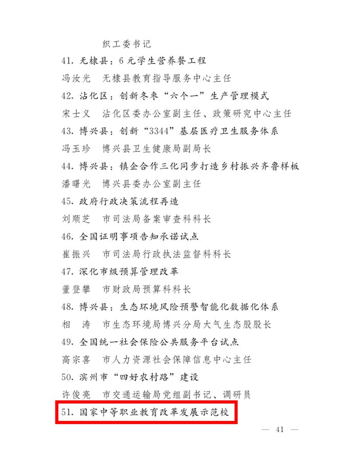 3月30日上午,全市“重点工作攻坚年”动员大会召开,中共滨州市委、滨州市人民政府表彰了“富强滨州”建设担当落实奖、体制机制改革创新奖先进集体和先进个人。滨州市高级技工学校党委书记、校长王树林获体制机制改革创新奖先进个人。