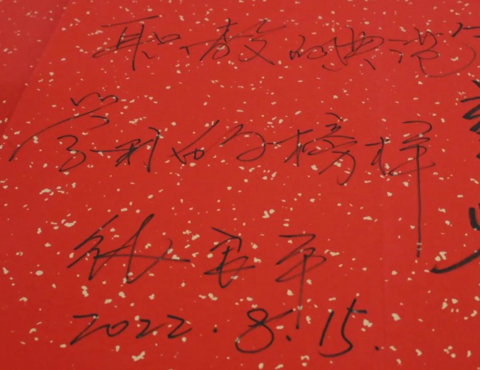 在校史馆留言册上,张良平写下“职教的典范 学习的榜样”
