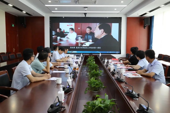 参观结束后,全体人员在北平楼八楼会议室召开座谈会,刘岳主持。首先,观看了滨州市高级技工学校红色教育专题片《信仰》,王树林介绍了学校基本情况,重点介绍了学校总体规划及红色办学情况。随后,各部门负责人进行了对口交流。