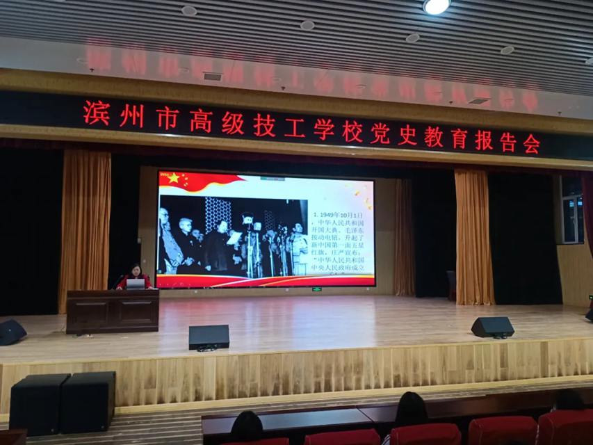 3月29日晚,作为滨州市高级技工学校庆祝中国共产党建党一百周年系列活动之一,第三期党史学习教育报告会在报告厅如约开讲。基础部副主任、思政课教师于翠芹作了题为《风雨兼程三十载 峥嵘岁月铸辉煌》的党史讲座,基础部2020级学生聆听报告。