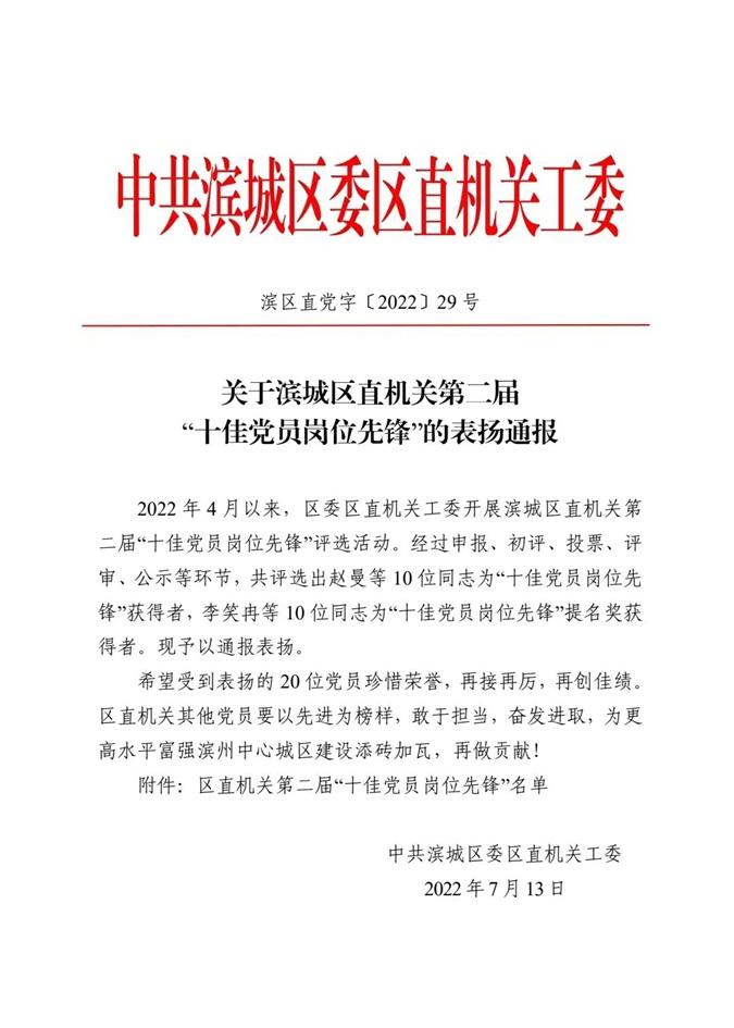 近日,滨城区直机关第二届“十佳党员岗位先锋”评选活动落下帷幕,滨州市高级技工学校团委副书记、学前教育教学中心党支部委员、副主任付首存荣获区直机关第二届“十佳党员岗位先锋”荣誉称号。