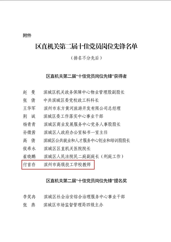 喜报 | 滨州市高级技工学校付首存老师荣获区直机关第二届“十佳党员岗位先锋”荣誉称号