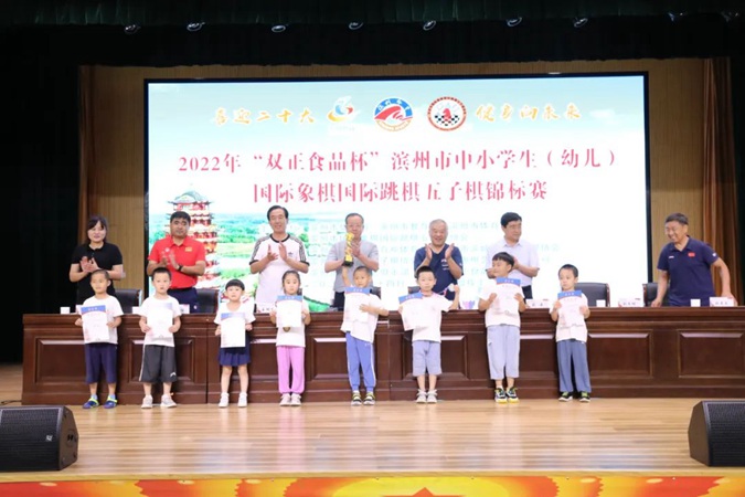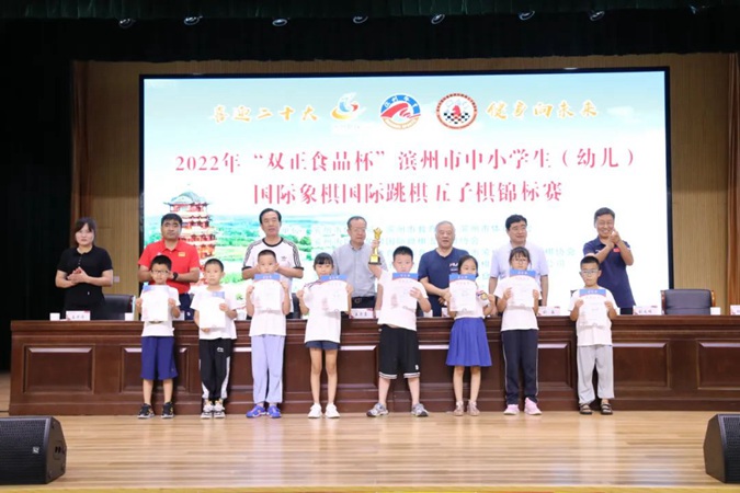 滨州市教育局党组成员、副局长王学勇,滨州市教育局原副局长、滨州市国际象棋国际跳棋五子棋协会名誉主席徐秋杰,滨州市高级技工学校党委书记、校长王树林,党委委员、副校长刘岳,滨州市体育总会办公室主任徐淳理,滨州市国际象棋国际跳棋五子棋协会主席、滨州市聚旗棋艺俱乐部总校长刘文明,滨城区教体局体育市场服务中心孟丹丹,滨州市国际象棋国际跳棋五子棋协会秘书长、本次大赛裁判长张英龙出席颁奖仪式并为获奖选手颁奖。