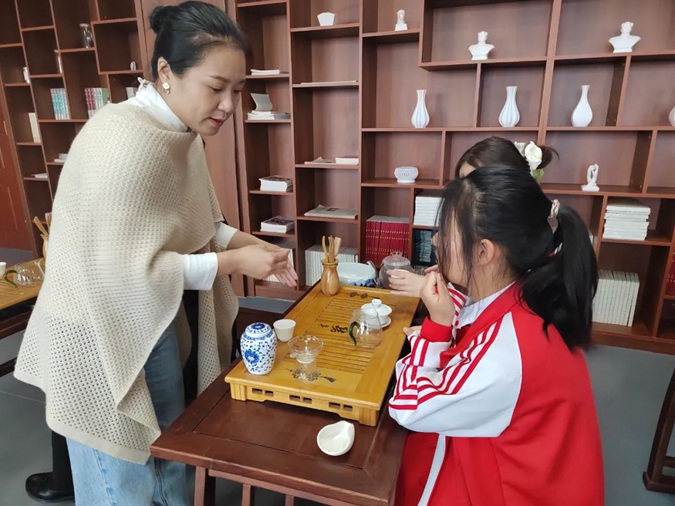 在张会长的指导下,同学们初步尝试龙井茶的冲泡,亲自体验泡茶的乐趣。温具、置茶、冲泡、倒茶、奉茶、品茶,在品味茶香的过程中感受中正平和的人生态度,让心灵得以净化,提升内心修养。