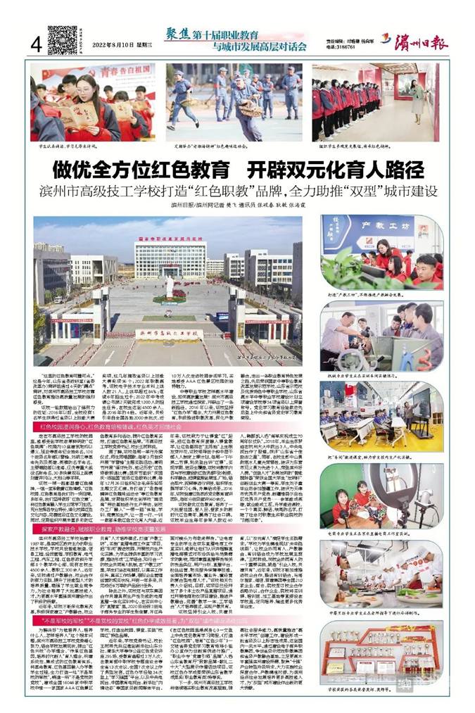 8月10日,《滨州日报》以《做优全方位红色教育 开辟双元化育人路径》为题,整版报道滨州市高级技工学校打造“红色职教”品牌,全力助推“双型”城市建设的经验做法。