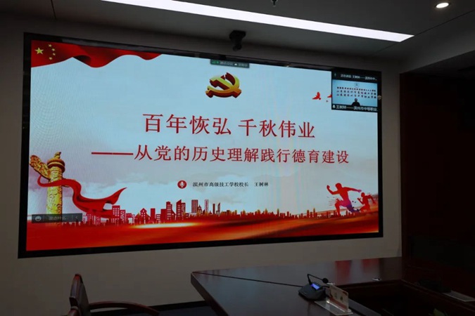 王树林以《百年恢弘 千秋伟业——从党的历史理解践行德育建设》为题,从一个牢记、一个号召、一个中国梦,两个确立,三个历史性飞跃,四个历史阶段,五个历史意义等方面分享了学习党的十九届六中全会精神的收获与体会;从突出红色办学、打造一所“不是党校的党校”,突出从严治校、铸造一所“不是军校的军校”,突出立德树人、培养崇尚英雄的“红粉少年”,突出德育品牌、打造全国德育名校,突出双型城市建设、打造校企合作新高地,突出红色宣讲、打造红色育人新高地六个方面分享了滨州市中等职业学校(滨州市高级技工学校)将红色教育做成特色品牌的实践经验。