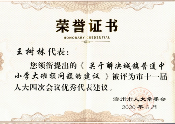 滨州市高级技工学校党委书记、校长王树林作为市人大代表领衔提出的《关于解决城镇普通中小学大班额问题的建议》,被评为市十一届人大四次会议优秀代表建议。