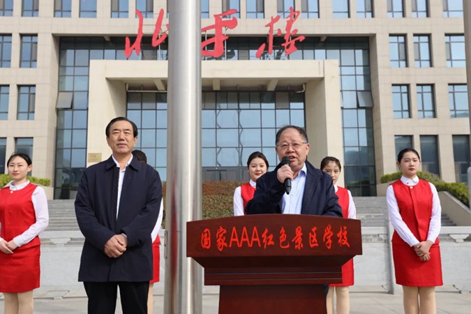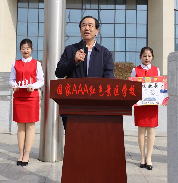 最后,王树林校长讲话。站立在国家AAA景区校园里,徜徉在“东方红”广场的“中国地图”上,王校长借用《再别康桥》,告别红色技校,情真意切、发自肺腑,表达了对学校、对全体师生依依不舍的深情厚谊。告别红色学校,告别朝夕相处、时刻挂怀的老师、学生,告别奋斗多年的工作岗位,王校长百感交集,几度哽咽。