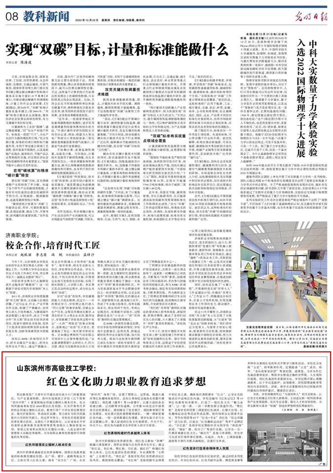 2022年12月22日,《光明日报》第8版(教科新闻)刊载文章《红色文化助力职业教育追求梦想》,多方位介绍滨州市高级技工学校如何紧紧围绕全环境立德树人根本任务,教育引导广大学生坚定理想信念、强化价值取向、养成良好品德,努力成长为担当民族复兴大任的时代新人。