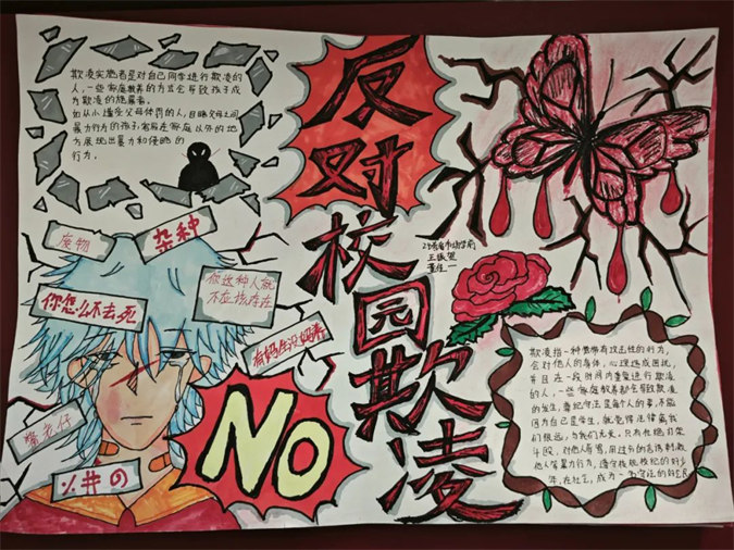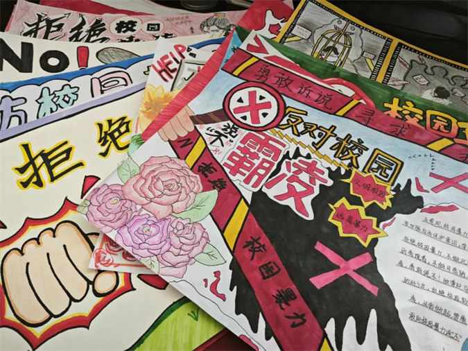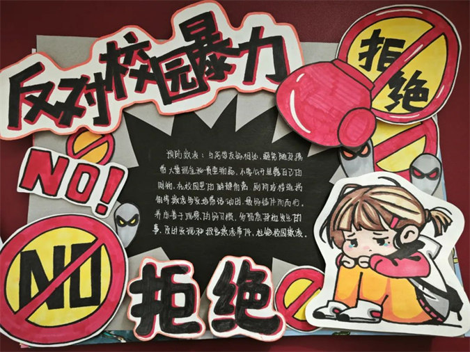 同学们充分发挥想象力与创造力,运用缤纷多彩的画笔,精心绘制出一幅幅主题鲜明、创意十足的手抄报。这些作品以独特的视角和生动的画面,向全体师生发出坚决抵制校园欺凌的号召,充分展现出同学们勇敢向欺凌和暴力 “say no” 的坚定决心与无畏勇气。每一张手抄报都犹如一颗闪耀的星星,在校园中传递着反对欺凌、守护和谐的正能量。
