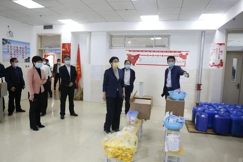 王晓娟一行现场查看了校门口体温检测点、消毒点、应急隔离区域设置、方案预案制定、小班化设置、餐厅、学生公寓、防疫物资储备等情况,现场听取了学校负责人的介绍。