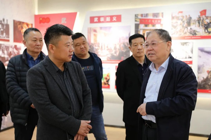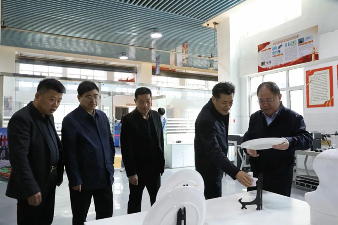 陈景山一行参观了东方红广场、嘉兴楼实训中心、韶山楼红色文化。穿过红色连廊,到井冈山楼现场参观了产教工坊、京东直播实训室。经“南泥湾”师生劳动基地,到古田楼参观了学生公寓,了解公寓管理情况。随后到北平楼参观了廉政文化作品展厅、伟人塑像厅、红色藏品展厅、图书馆、百年党史馆、校史馆、国防教育展馆等红色展馆。