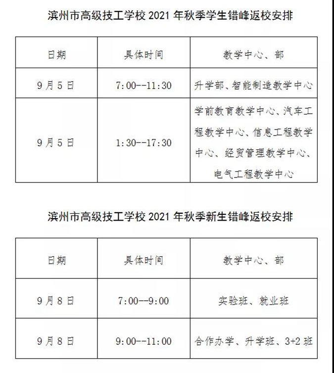 我校老生定于2021年9月5日返校,新生定于2021年9月8日返校。根据山东省《2021年全省学校秋季学期疫情防控工作方案》错时错峰返校要求及山东省外学生需提前3天返校规定,具体安排如下: