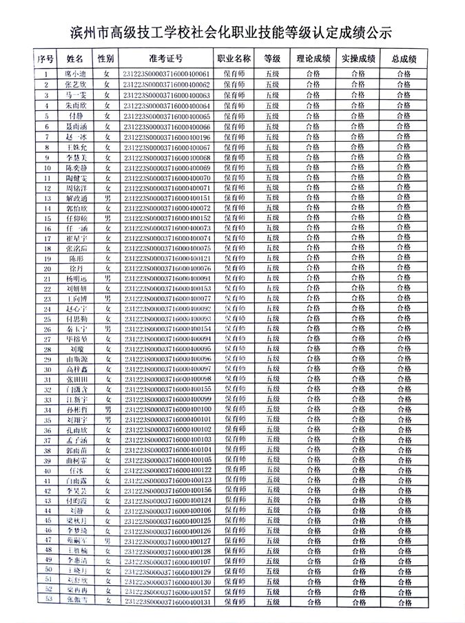 滨州市高级技工学校12月23日社会化职业技能等级认定(第五期)成绩公示