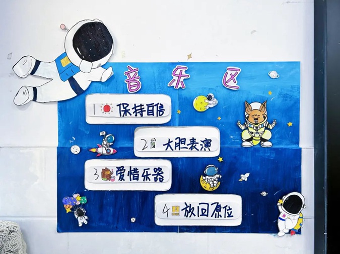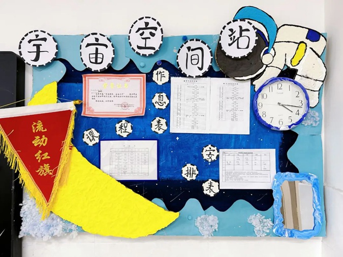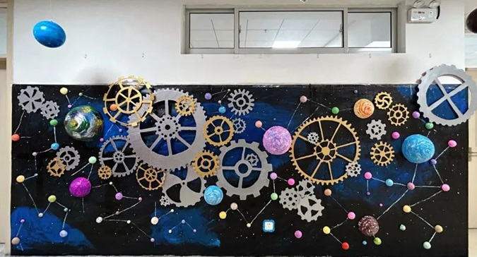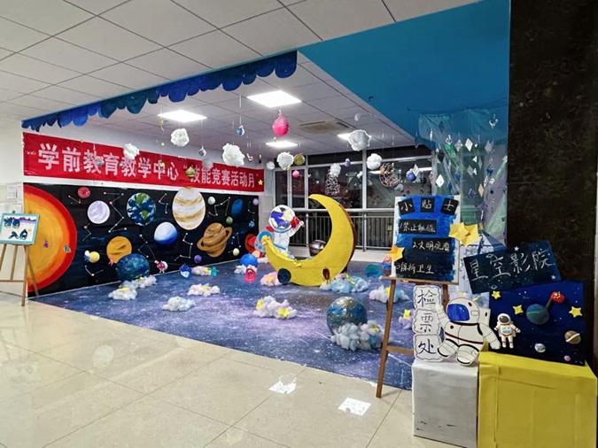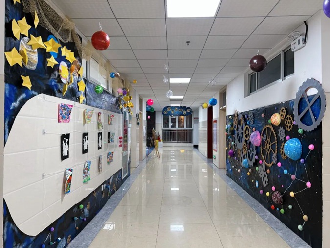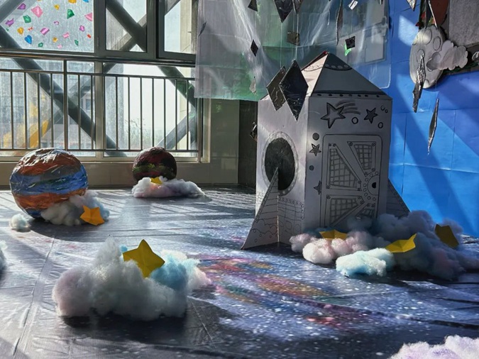 此次环创汇报展以“星际穿越”为主题,各班学生团结协作、大胆构思、精心创设,利用废旧纸箱等各种综合材料,用自己灵巧的双手和对幼儿教育的独特感悟,创造出各具特色的“星空”作品,布置门厅环境空间、长廊文化、班级牌、主题墙、班务栏、区角牌等,将教育与艺术和谐融为一体。