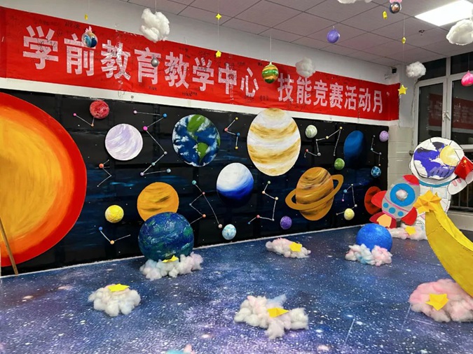 为提高学生的专业技能,锻炼学生团队协作能力,滨州市高级技工学校学前教育教学中心组织开展了技能活动月系列活动。作为活动之一,尹安琪老师带领学前专业学生进行了环境创设展示。