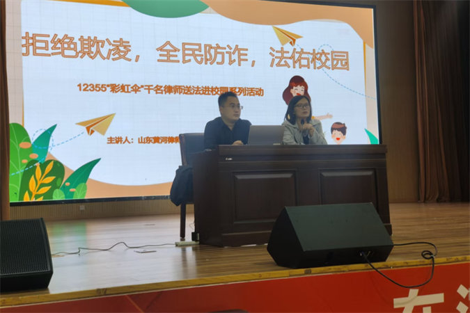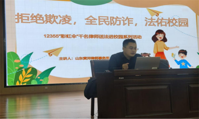 本次报告会特别邀请到山东黄河律师事务所李彬律师担任主讲嘉宾。李律师以“拒绝欺凌、全民防诈、法佑校园”为主题,结合青少年成长特点,为师生带来了一场生动深刻的法治宣讲。