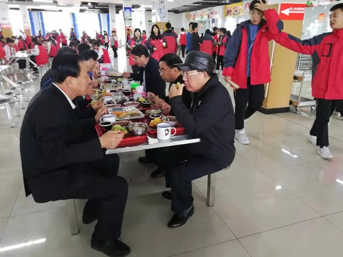 最后,任光礼将军来到学生餐厅,了解学生用餐情况,并一起品尝忆苦思甜红军饭。