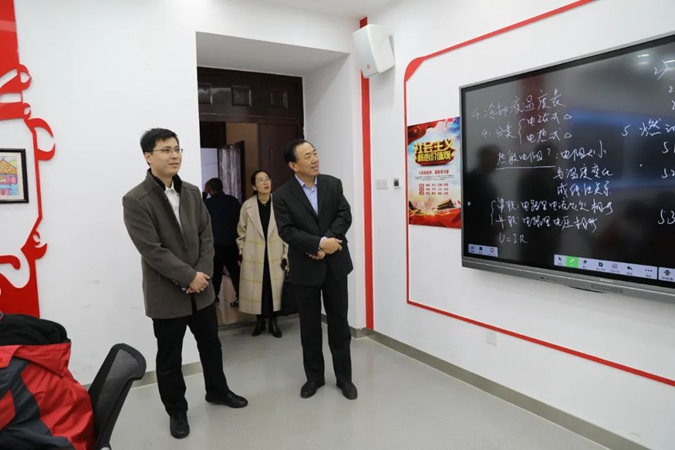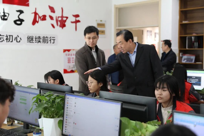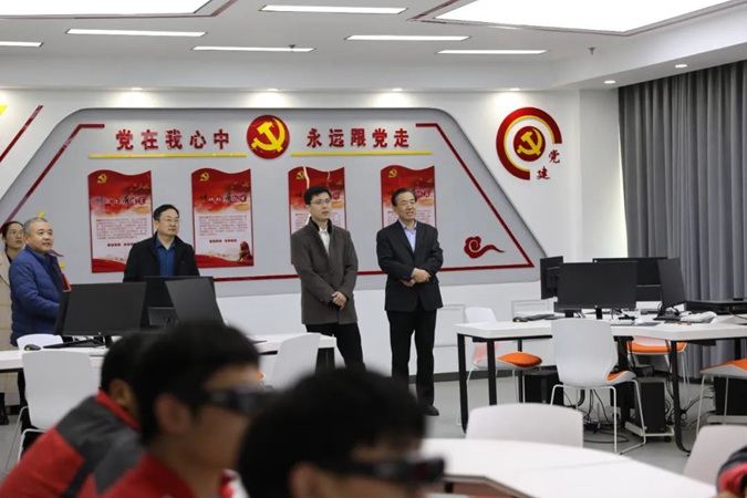 郑辉一行参观了东方红广场,在嘉兴楼了观看了学生实训,到产教工坊、京东网络直播实训室实地了解校企合作开展情况;参观了韶山楼、井冈山楼红色文化,深入教室、学生公寓、学生餐厅,了解学生学习、生活情况。