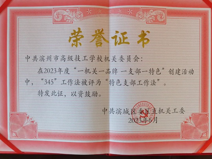 6月28日,滨城区直机关工委举办“一机关一品牌 一支部一特色”创建成果汇报展示活动。滨州市高级技工学校机关党支部“345”工作法被评为“特色支部工作法”。